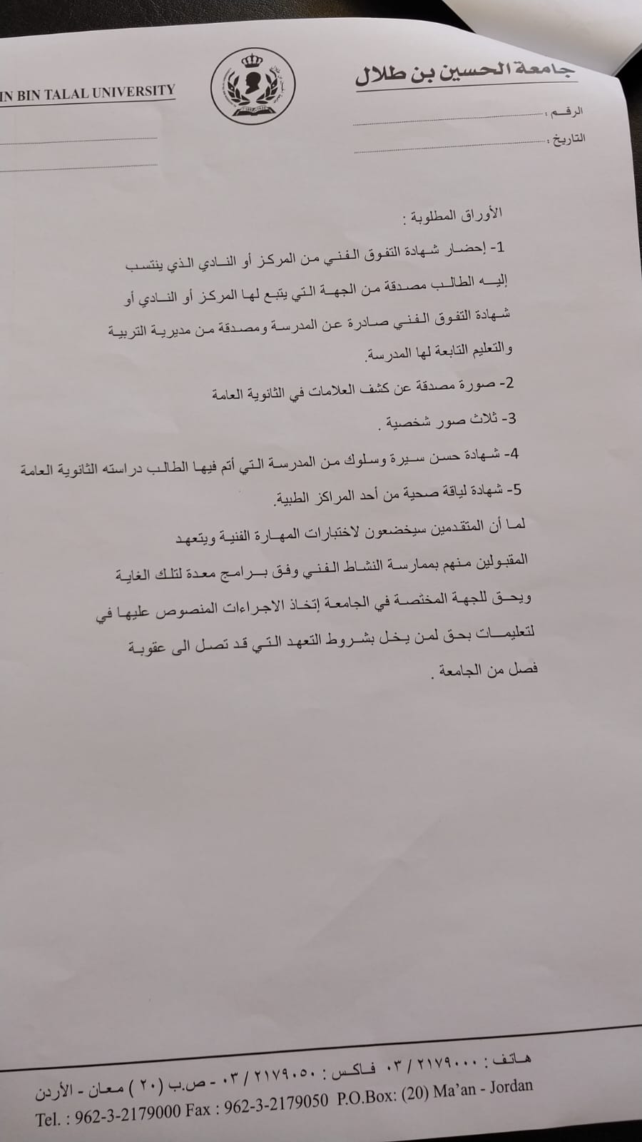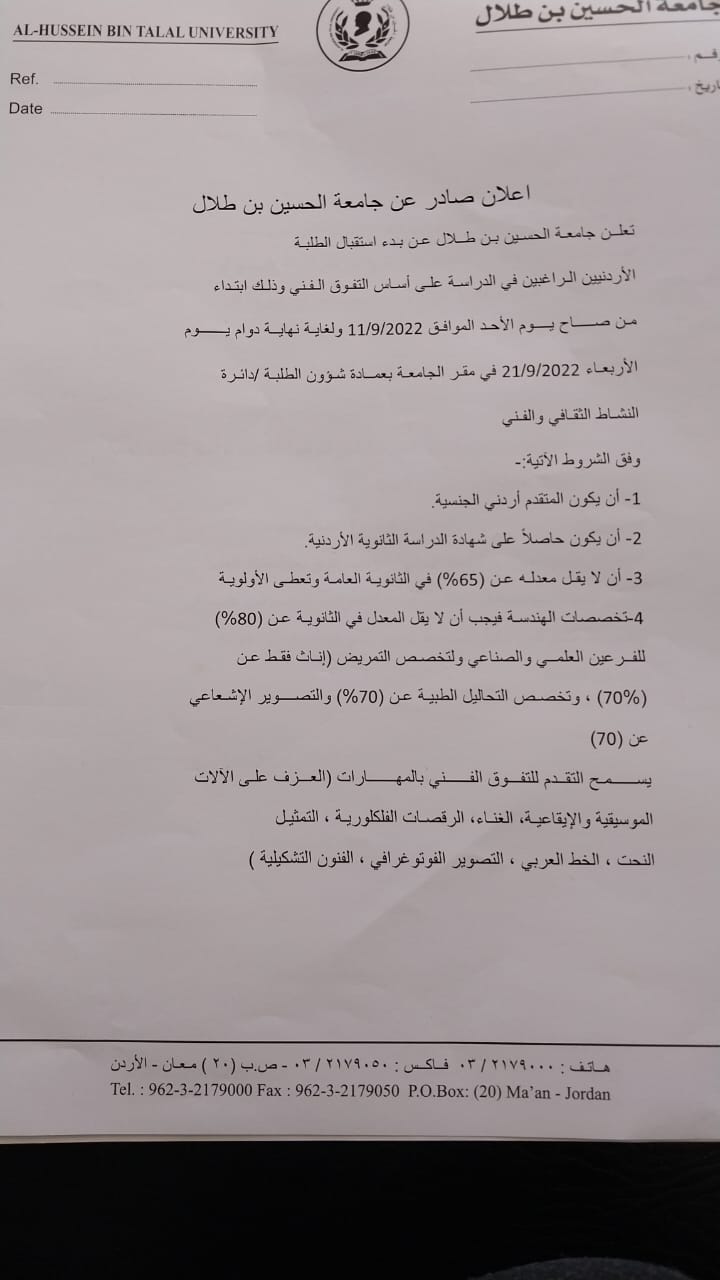 إعلان صـادر عن جامعة الحسين بن طلال للطلبة المتفوقين فنياً