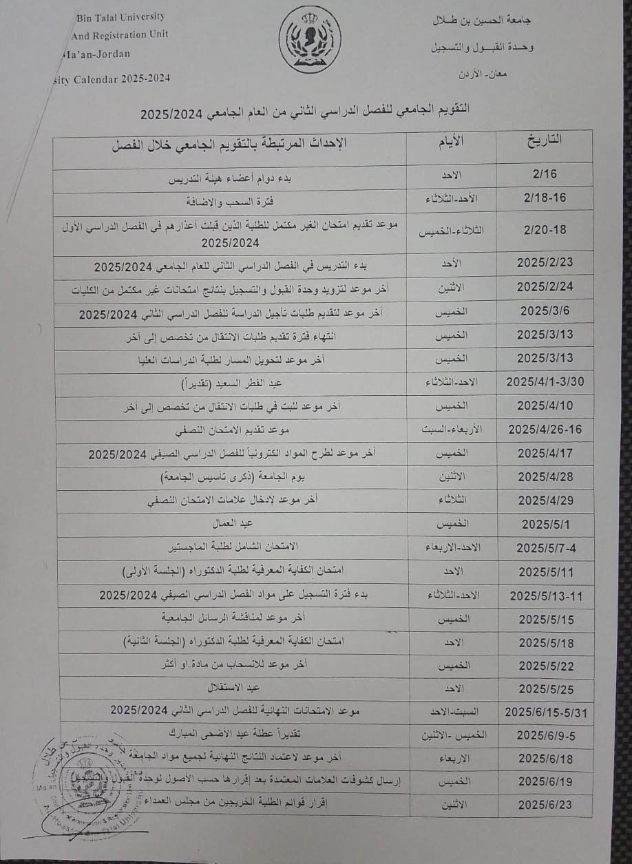 التقويم الجامعي للفصل الدراسي الثاني من العام الدراسي 2024/ 2025