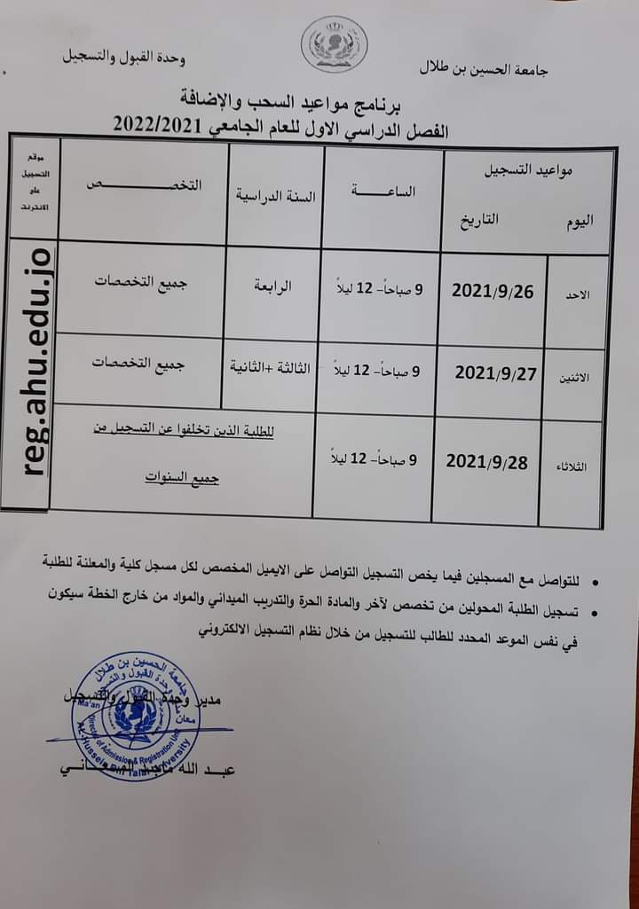 مواعيد السحب والإضافة للفصل الدراسي الأول من العام الدراسي 2021 / 2022